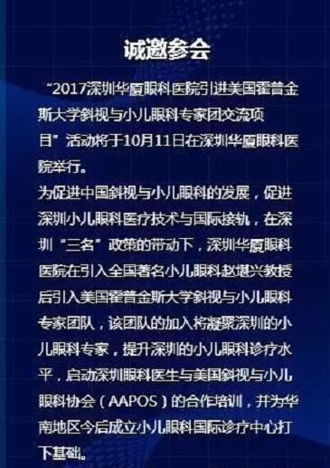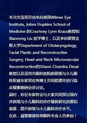 2017年深圳6686 - 看球聊球追世界杯就来6686体育有限公司官方网站引进美国霍普金斯大学斜视与小儿眼科专家团交流项目暨斜视与小儿眼科较新诊疗新进展环球交流会将于10月11日在深圳6686 - 看球聊球追世界杯就来6686体育有限公司官方网站举办。