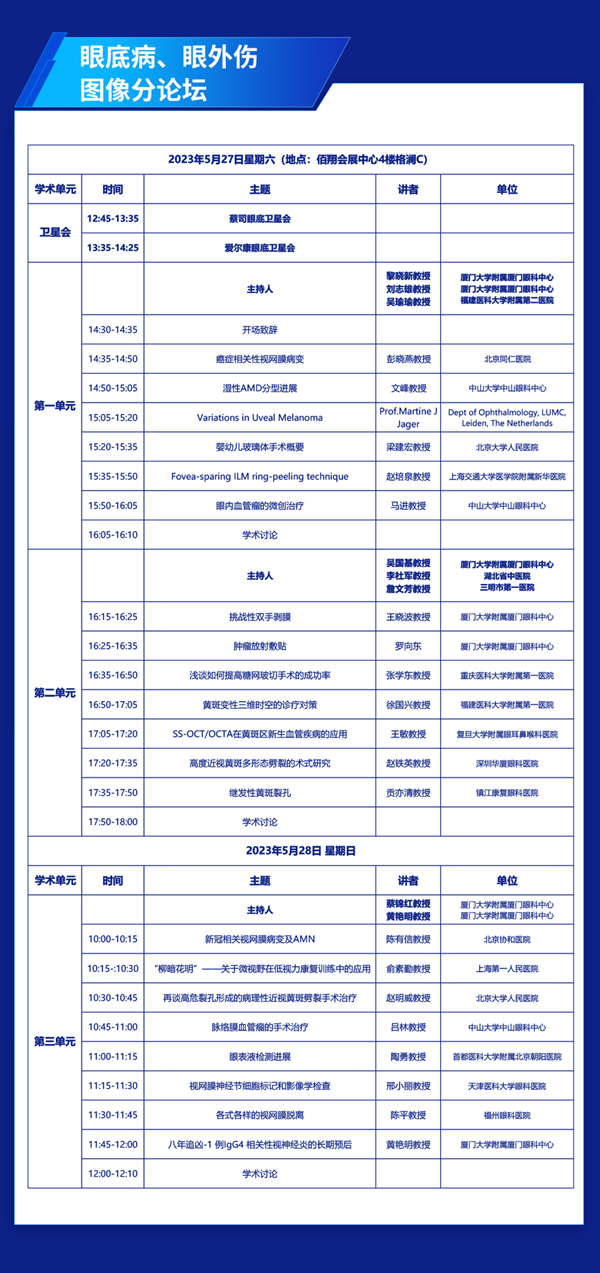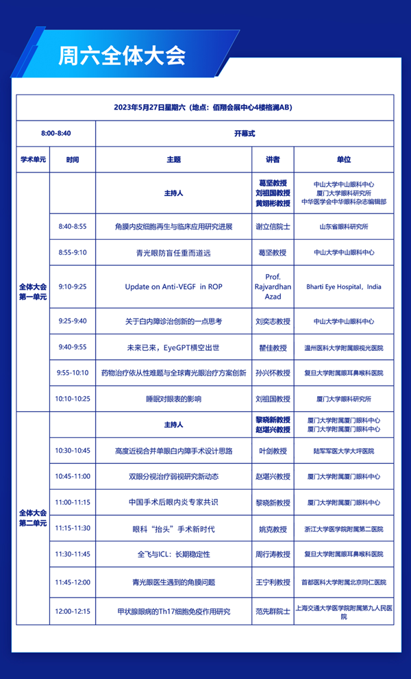 二零二三,鹭岛之滨,天高海阔,盛宴将启。第九届6686体育国际论坛将于5月27-28日在厦门佰翔五通会展中心举行。本届论坛十分荣幸地邀请到了黎晓新教授、赵堪兴教授、葛坚教授、孙兴怀教授、刘祖国教授共同担任大会主席,更有谢立信院士、姚克教授、王宁利教授、范先群院士、刘奕志教授、杨培增教授、许迅教授、瞿佳教授(按演讲顺序排序)等近百名国内眼科专家及国际知名眼科专家精彩授课。