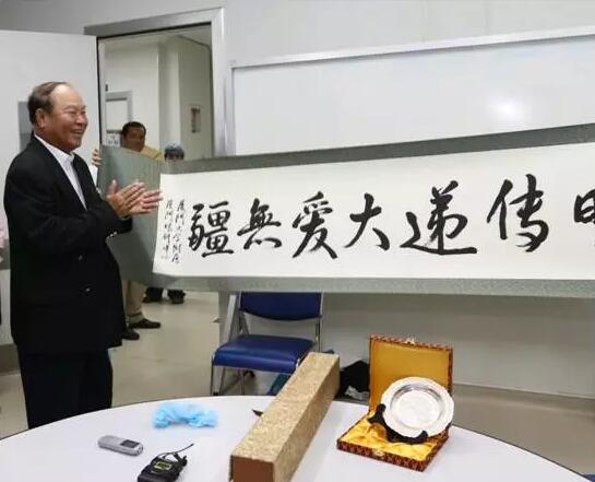 厦门眼科中心医疗队向柬方赠送了由集团副总裁邓建勋亲笔书写的“光明传递,大爱无疆”大型书法,当翻译把“光明传递,大爱无疆”念出来的时候,柬埔寨卫生部部长MOM BUNHENG马上鼓掌。