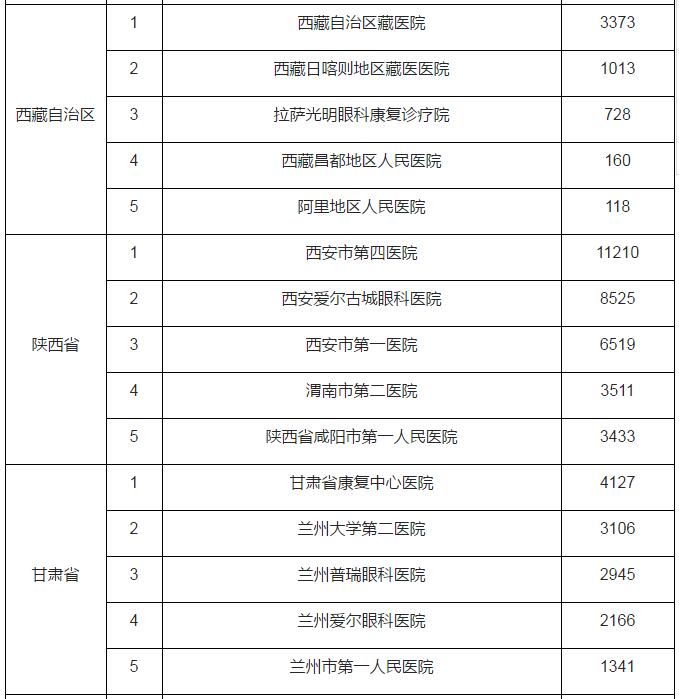 二、2017年全国报送白内障手术 数排名前五位的医疗机构分别是:中山大学某眼科中心、上海某眼科医院、 都医科大学附属某医院、温州医科大学附属某医院和济南市某眼科医院。全国填报 数排名前30位的医疗机构详见如下: